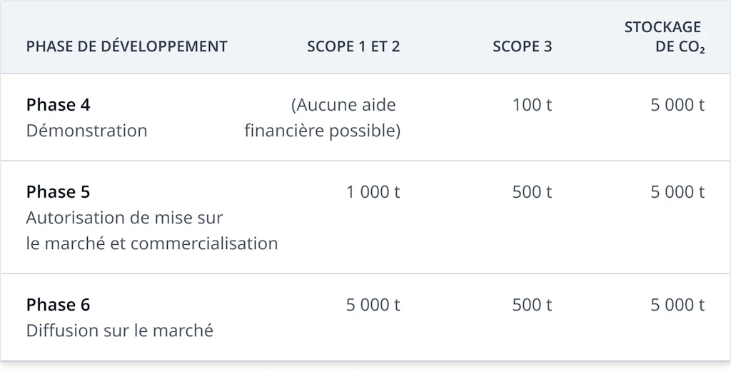la mesure n’a pas encore testée et mise en œuvre à l’échelle réelle (les aides financières pour cette phase ne sont possibles que pour la réduction des émissions du scope 3, c’est-à-dire dans les processus directement en amont ou en aval, ou pour les mesures de stockage de CO2; les réductions d’émissions de scopes 1 et 2 ne sont pas encouragées dans cette phase de développement) - Phase de développement 5 (autorisation de mise sur le marché et commercialisation):